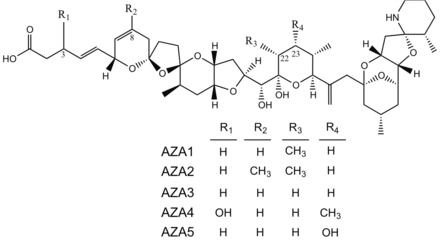 Azaspiracids (AZA) are a group of polycyclic ether marine algal toxins produced by the small dinoflagellate Azadinium spinosum that can accumulate in shellfish and thereby cause illness in humans.[1][2]