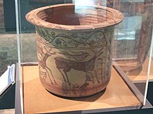 Decorated ancient Iberian earthenware showing deers, one of them attacked by a wolf. Cueva del Cabuchico, Azuara. 1st century BC