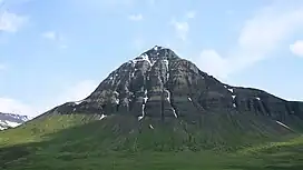 Búrfellshyrna (Icelandic pronunciation: [ˈpurˌfɛlsˌhɪ(r)tna] ) is a mountain in the Svarfaðardalur in northern Iceland. It is made of basaltic layers of Tertiary age. It reaches 1,091 meters at its highest peak. It is situated between the valleys of Búrfellsdalur and Grýtudalur. In Búrfellsdalur is the Búrfell Glacier, which exhibits what is sometimes referred to as a glacier surge. Farms surrounding Búrfellshyrna include Búrfell and Hæringsstaðir.