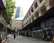 The han' is located in the central historic market district that extends from the Grand Bazaar to the Eminönü neighbourhood on the shore of the Golden Horn.[1] Since the founding of the first bedesten by Mehmet II in the mid-15th century, the Grand Bazaar developed into the city's main hub of international trade, spawning entire districts of shops, warehouses, and merchant lodgings.[2][3] A han, a type of urban caravanserai, was a common type of commercial structure in Ottoman architecture (and more broadly in Islamic-world architecture) which served a number of functions including lodging for foreign merchants, storage for goods or merchandise, housing for artisan workshops, and offices from which to conduct dealings.[2] A number of hans were built over the centuries in and around the Grand Bazaar district.[1] The Büyük Yeni Han was completed in 1763 or 1764 CE (1177 AH) on the orders of Sultan Mustafa III.[1][4][5] Records show that the land for the new building was procured in 1761 partly through a series of property exchanges negotiated with the existing waqfs (official foundations established through Islamic endowments) and other properties on the site. For example, one piece of the land, a plot of around 523 square meters belonging to the waqf of Çavuşbaşı Ali Agha, was obtained in exchange for various other properties throughout Istanbul in an agreement dated to August 2-11, 1761.[5] Another plot of land occupied by a house, covering around 402 square meters, was obtained in exchange for an estate house in the Edirnekapı area of the city, as part of an agreement dated to September 1-10 of the same year.[5] The records suggest that construction thus started in late 1761, right after these (and other) agreements were concluded.[5] Although the chief architect of the project has not been identified, the building supervisor is named in multiple documents as Şehremini Haşim Ali Bey. Some scholars believe that around this period the role of "chief architect" had decreased in importance by comparison with the construction supervisor, which suggests that Şehremini Haşim Ali Bey may have practically played a very important role in the building's design and execution.[5] The building's completion date of 1177 AH (1763-1764 CE) is based on an inscription on its northeast corner and on the date of the waqf agreement written to govern it.[5]