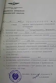 Certificate confirming the operation of Bălți-Leadoveni Airport with Tu-154 and Il-76T aircraft