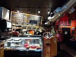Focusing on Southern-style cuisine,[11] the menu offers natural grass-fed beef, chicken, pork, and other meats that have been dry-rubbed and slow-smoked for up to 14 hours with local apple and hickory woods. Treitman makes his sauces and his own ketchup from scratch.[5]