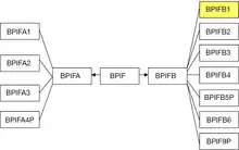 Genes for the BPI/LBP/PLUNC superfamily are found in all vertebrate species, including distant homologs in non-vertebrate species such as insects, mollusks, and roundworms.[9][10] Within that broad grouping is the BPIF gene family whose members encode the BPI fold structural motif and are found clustered on a single chromosome, e.g., Chromosome 20 in humans, Chromosome 2 in mouse, Chromosome 3 in rat, Chromosome 17 in pig, Chromosome 13 in cow. The BPIF gene family is split into two groupings, BPIFA and BPIFB. In humans, BIPFA consists of 3 protein encoding genes BPIFA1, BPIFA2, BPIFA3, and 1 pseudogene BPIFA4P; while BPIFB consists of 5 protein encoding genes BPIFB1, BPIFB2, BPIFB3, BPIFB4, BPIFB6 and 2 pseudogenes BPIFB5P, BPIFB9P. What appears as pseudogenes in humans may appear as fully functional genes in other species.