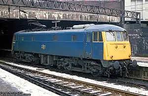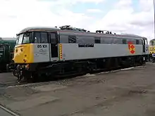 The Class 85 is an AC electric locomotive intended for express services on the West Coast Main Line.[1] Its design bore considerable similarities to the earlier British Rail Class 81, particularly in terms of their shared AEI-supplied equipment. One key area of difference was its adoption of semiconductor-based rectifiers and a rheostatic braking system; the latter was viewed as likely to generate considerable cost savings in comparison to conventional braking by reducing wheel wear.[1] A small proportion of the locomotive's equipment, such as the bogies, were designed by the French industrial group Alstom.[1]