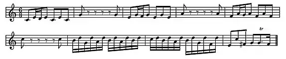 The third movement is a four-voice fugue in 6/8. It includes a countersubject typical of permutation fugues, which, unusually, engages in dialogue with the subject. Several features of the fugue suggest that it represented a considerable advance for Bach, especially considering that there are middle entries as far as the mediant and the dominant of the dominant.[8] Somewhat unusually for Bach, the fugue includes very few episodes, the longest being the coda of the piece, which is based on various style brisé figures.