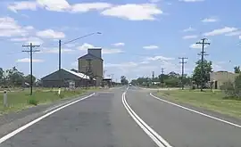 Baan Baa is named after a local property of the same name, and is aboriginal for "swim away".[4] The railway line between Boggabri and Narrabri South Junction (which included the future township of Baan Baa) was opened on 1 October 1882.[5] The railway station at Baan Baa opened in 1883.[6] The Baan Baa Post Office opened on 9 February 1885 and closed on 19 March 1988.[7] The Baan Baa Literary Institute building which constructed of local cypress pine timber, was erected in 1923, and is now the local community hall. Baan Baa was once a bustling railway village, which once had its own bakery, butchery and service station. The village now serves primarily a grain rail terminal.[8] Baan Baa once had the longest railway platform in country New South Wales.[9]