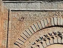 Nonetheless, the gate has preserved its rich stone-carved decoration from the Almohad period, again comparable to that of Bab er-Rouah and of Bab Oudaia in Rabat.[2] The façade consists of sandstone, likely quarried in the Gueliz area near Marrakesh.[8][4]: 260 The original arch of the gate is surrounded by alternating semi-circular bands that alternate between radiating lines and interlacing arch motifs.[4] The spandrels (corner areas) are covered in floral motifs (arabesques), each with a carved shell in the middle.[4] All of this ornamentation is in turn framed by a long frieze carved with an inscription from the Quran in foliated Kufic letters.[7][2] The inscription includes excerpts from the Surah al-Hijr.[4]: 266 On either side of the decorated facade are pilasters which are sometimes thought to have supported a canopy or awning but which is believed by many scholars to have been merely a decorative transition between the decorated facade and the flanking bastions of the gate.[2][9][4]: 266