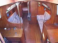 The interior of the Baba contains a lot of custom teak work. Some versions of the boat have the entire interior staved with teak. The cabin sole is made from teak planking separated with holly strips. It has a very spacious-feeling 6'4" of headroom. Sleeping berths consist of a spacious V berth with good storage below and access to the chain locker via louvred doors, a full length berth in the main cabin on either side of the boat and on many models, a quarter berth on the aft starboard quarter, however in some models this was replaced by extra stowage. A small galley is built on the port aft side and opposite is a spacious chart table. Forward on the starboard side are the heads. The engine is mounted below the cabin companionway and is boxed in with a substantial teak housing. There are lockers and stowage areas all over the boat. The Baba 30 typically came with two separate water tanks which reside under the port and starboard berths, each holding about 100 L (25 US gal). However many variants of this tankage have been discovered on different Babas.