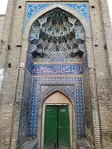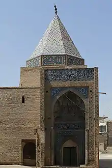 Rectangular in shape, the building is topped by a conical dome that has eight layers.[7] On the base of the dome, the words Allah-Tauba, Nabi Muhammad, Din-i-Islam, and Imam Ali are visible in a repeated manner.[8] The entrance has a shabestan with an arch above full of muqarnas.[9]