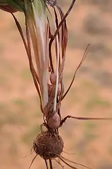 Bobbejaantjies are perennial geophytes that appear seasonally above the ground with leaves and flowers. The leaves and stems are shed in anticipation of the dry and hot summer, when the plants survive with their corms. The roots that appear from the base of the corm are approximately the same diameter along their length and do not branch. The corms are enveloped in a multi-layered fibrous tunic that sometimes has a netted appearance. From the corm's top emerges a stem that is circular in cross section, either or not branching, mostly hairy or rough but sometimes smooth, and that may be entirely subterranean or appear above the ground. The base of the stem is usually surrounded by a collar consisting of several fibrous layers, but this collar is poorly developed in Babiana grandiflora, B. nana and B. petiolata.[1]