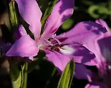 The various species of bobbejaantjie have specialised flowers adapted to be pollinated by the Cape sugarbird and sunbirds, and by insects of four different orders, more in particular bees, tangle-veined flies, monkey beetles, and owlet moths. Pollination that occurs as a result of gathering nectar by native bees and honeybees is most common (shown in 18 species, likely in 35 more species). These species share mirror-symmetrical flowers with an upper and lower lip. This type of pollination appears to be the ancestral condition both in Babiana and many other Crocoidae genera. Pollination by female bees specifically foraging for pollen is shown in one species, but probably also occurs in four others that share prominent anthers and radially symmetric flowers. In 13 species pollination by long-tongued flies is established and probably occurs in five more. Proof of pollination by moths exists for one species but is expected in two others as well. Pollination exclusively by monkey beetles has been demonstrated in six species with radial symmetrical flowers. Two species that are pollinated by birds have scarlet flowers with a wide tube, and stiff stamens that extend far from the tube, and is inferred for one more. In three species pollination is accomplished by both bees and monkey beetles. It appears that shifts to other pollinators occur rather frequently both in Babiana and in other Crocoidae, and adaptations to accommodate the different pollinator groups have led to remarkably similar flowers in different genera in the Iridaceae family such as Lapeirousia, Hesperantha, Gladiolus and Babiana, as well as in Pelargonium and Orchidaceae that occur in the same area and habitat. Several more Babiana species have been described since this research was finalised.[13]