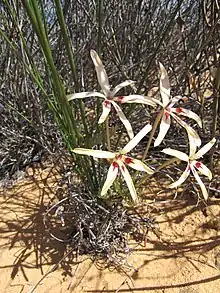 Babiana brachystachys is a species of geophyte of 20–30 cm (7.9–11.8 in) high that is assigned to the family Iridaceae. It has cream or pale pink, only slightly mirror-symmetrical flowers that are pink on the reverse with a long narrow tube that splits into six tepal lobes, three stamens, a style that divides in three branches opposite the tip of the anthers and line-shaped leaves that are circular in cross section.[1] It is an endemic species of South Africa that can be found on sandy hills and inland dunes in the Northern Cape province. It flowers in September and October.[2]