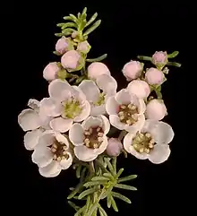 Babingtonia camphorosmae, commonly known as camphor myrtle,[2] is a species of flowering plant in the family Myrtaceae and is endemic to the southwest of Western Australia. It is a prostrate to low-growing shrub with linear to thread-like leaves and white or pink flowers in groups of up to five, each flower with ten to thirteen stamens.