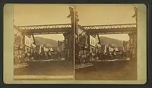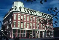 At an altitude of 10,000 feet, Leadville was the second largest city in Colorado. It boasted over 100 saloons and gambling places, multiple daily and weekly newspapers, and 36 brothels. Tabor's presence seemed to be everywhere.[16] He opened the Tabor Opera House in Leadville, bought luxury items for his wife, Augusta, and established a private army that he used for protection of his holdings and as a force against striking miners. He spent his money lavishly, mostly on his own entertainment—drinking, gambling and frequenting brothels. In 1880, Augusta moved away from him to live in Denver while Tabor enjoyed himself in Leadville.[15] A Denver newspaper columnist described him as "Stoop-shouldered; ambling gait ...black hair, inclined to baldness ....dresses in black; magnificent cuff buttons of diamonds and onyx ...worth 8 million dollars."[16] Historian Judy Nolte Temple writes that it "seemed inevitable that the prettiest woman in the mining West would eventually meet the richest man."[16]