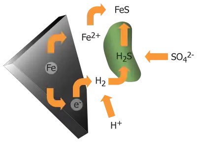 - ↑ Li, Yingchao; Xu, Dake; Chen, Changfeng; Li, Xiaogang; Jia, Ru; Zhang, Dawei; Sand, Wolfgang; Wang, Fuhui; Gu, Tingyue (2018). "Anaerobic microbiologically influenced corrosion mechanisms interpreted using bioenergetics and bioelectrochemistry: A review". Journal of Materials Science & Technology. 34 (10): 1713–1718. doi:10.1016/j.jmst.2018.02.023. ISSN 1005-0302. S2CID 139700002. Archived from the original on 2022-08-07. Retrieved 2021-10-02.
