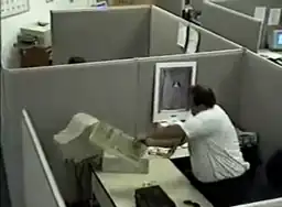 In the surveillance-style video, an office worker in his cubicle is becoming increasingly irritated with the computer.[1] He slaps the monitor and pounds on the keyboard with his fist before picking the keyboard up and using it like a baseball bat to knock the monitor off of the desk.[1] His neighbor peers over the partition twice in curiosity.[1] The video ends with the protagonist kicking the monitor out of his cubicle.[1]