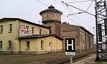 ![]() Entrance and service buildings, rear engine shed with water tower (in 2012; everything was demolished in 2017) | ||||||||||||||||||||||||||||||||||||||||||||||