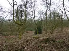 This is ancient semi-natural woodland on acidic soils, and it has been forested for over 700 years. It is mainly pedunculate oak, with varied ground flora including creeping soft-grass, wood anemone, yellow archangel and bluebell. A small marsh has very diverse herbs.[3]