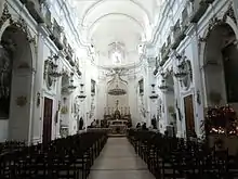 The church plan is with one nave and a barrel vault with simple pillars, four side altars, and is embellished by a sober stucco decoration.[1]