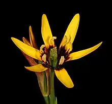 Bright orange or yellow unscented flowers are present between August and October.[3][5] They have a firm texture and lack nectar.[5] Each plant has between one and five flowers growing in a funnel of successively smaller flowers.[1] The lower flowers are on short pedicles.[5] Each flower has a distinctive dark eye at the center. The stamens have maroon filaments and yellow anthers.[4] The red-flushed undersides of the petals are visible during cooler weather as the flowers only open when it is warm.[1] Each flower lasts only a few days, the tepals falling off to make space for the enlarging cylindrical, 3-lobed ovary as the fruits start to develop.[1]