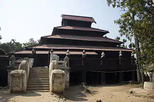 The Bagaya Monastery which consists of the seven-tiered spire has Dhanu hall and Bhawga hall. It also has eight stairways made up of bricks.[6] The monastery, which was built with 267 gigantic teak wood posts, has a structure of great dimensions: 188 feet (57 m) high in length and 103 feet (31 m) in width.[7] This weather-worn but magnificent monastery stands in the middle of wide paddy fields, with palms, banana trees and thorny green bushes clustered in profusion around its shady base.[8] The monastery is decorated with splendid Burmese architectural works such as carvings, floral arabesques, the ornamentation with curved figurines and the reliefs of birds and animals as well as small pillars decorated on the wall, the artistic works of Inwa Era.