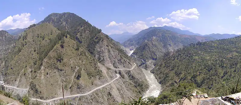 Baglihar Dam (Hindi: Baglihār Bāndh), also known as Baglihar Hydroelectric Power Project, is a run-of-the-river power project on the Chenab River in the Ramban district of Jammu and Kashmir, India.[3] The first power project executed by the Jammu and Kashmir Power Development Corporation, it was conceived in 1992 and approved in 1996, with construction begun in 1999. The project was estimated to cost US$1 billion. The project consists of two-stage of 450MW each. The first stage of the project was completed in 2008-09 and was dedicated to the nation by the Prime Minister Manmohan Singh of India. The second stage of the project was completed in 2015–16, and was subsequently dedicated to the nation by the Prime Minister Narendra Modi of India.[4][2]