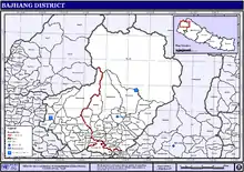 Bajhang District (ⓘ), a part of Sudurpashchim Province, is one of the seventy-seven districts of Nepal. The district, with Chainpur, that is part of Jaya Prithvi Municipality, as its district headquarters, covers an area of 3,422 km2 (1,321 sq mi) and has a population (2011) of 195,159.[1] The headquarter Chainpur is situated at the bank of Seti River and Bauli Khola. Bitthad Bazar is bordered with Baitadi District which is the place of Bitthad Kalika and Kedar. This place was famous for fresh milk and yogurt.