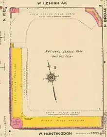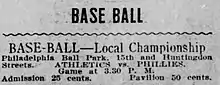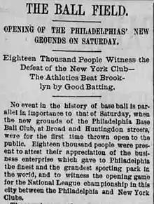 - ↑ "The Ball Field: Opening of the Philadelphia's new grounds on Saturday". Philadelphia Inqurier. Philadelphia, Pennsylvania. May 2, 1887. p. 3.