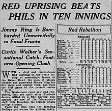 - ↑ "Red Uprising Beats Phillies In Ten Innings". Philadelphia Inquirer. Philadelphia, Pennsylvania. July 11, 1923. p. 20.