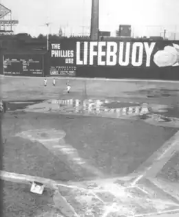 While they were occasionally at least respectable in the dead-ball era, once the lively ball was introduced the Phillies nearly always finished in last place, substantially helping them towards the 10,000-loss "milestone" they reached on July 15, 2007.[34] It was an extremely hitter-friendly park, making it an especially difficult place to pitch. For a number of years, a huge advertising sign on the right field wall read "The Phillies Use Lifebuoy", a popular brand of soap. This led to the oft-reported quip that appended "... and they still stink!" In 1936, a vandal snuck into the Baker Bowl one night and actually wrote that phrase on the Lifebuoy ad.[35] Conventional wisdom ties their failures to the Baker Bowl, but they remained cellar-dwellers in Shibe Park as well.