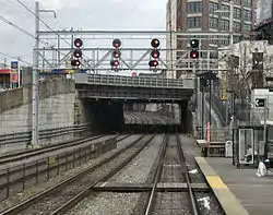 The active and in-use North Broad station serving SEPTA Regional Rail's Lansdale/Doylestown Line and Manayunk/Norristown Line stands behind the former station building.