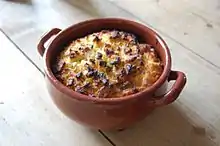 The pudding originated in the Derbyshire town of Bakewell.[1][6] The origins of the pudding are not clear, but a common story is that it was first made by accident in 1820 (other sources cite 1860)[7] by Mrs Greaves, who was the landlady of the White Horse Inn (since demolished). She supposedly left instructions for her cook to make a jam tart.[1][2][8] The cook, instead of stirring the eggs and almond paste mixture into the pastry, spread it on top of the jam. When cooked, the egg and almond paste set like an egg custard, and the result was successful enough for it to become a popular dish at the inn.[2][5][7]