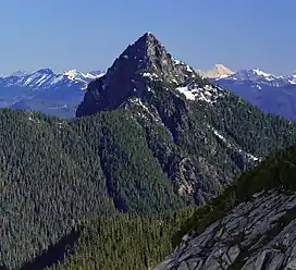 Bald Eagle Peak is a 6,259-foot (1,908-metre) mountain summit located 7.4 mi (11.9 km) southeast of Skykomish, in eastern King County of Washington state.[4] It's part of the Cascade Range, and is situated in the Alpine Lakes Wilderness, on land managed by Mount Baker-Snoqualmie National Forest. Precipitation runoff from this mountain drains into tributaries of the Foss River. This peak is set on the divide between the east and west forks of Foss River. The nearest neighbor is Silver Eagle Peak, 1.1 mi (1.8 km) to the southwest, and Bald Eagle Lake lies in a cirque midway between the pair.[1] The first ascent of this peak was made in 1933 by Hermann Ulrichs and Ben Falkenburg via the North Ridge.[2] This mountain's toponym and correct location was officially adopted September 8, 1988, by the U.S. Board on Geographic Names.[4] Some older maps will have this peak erroneously labeled at Silver Eagle Peak's location.
