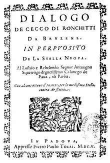 Galileo did not respond to this provocation, but he scribbled marginal notes in his copy of it with terms such as "bue" ("ox") and "coglione" ("balls"), deriding him for his ignorance of both Italian and of Latin.[5] Then, concealing his identity behind the pseudonym 'Cecco di Ronchitti', he responded to Antonio Lorenzini and his pamphlet Discorso intorno alla Nuova Stella (Padua, 1605) in a caustic pamphlet entitled Dialogo de Cecco di Ronchitti da Bruzene in perpuosito de la stella Nuova, written in the ancient dialect of Padua (called "dialetto pavano").[6]