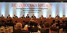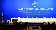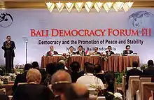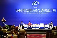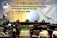 The Bali Democracy Forum (BDF) is a meeting held in Bali, and attended by representatives from nations in the Asia Pacific region. The forum was initiated by Indonesia in 2008 with the stated aim of fostering democracy, human rights, equality, and mutual respect.[1]