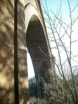 Ballochmyle Viaduct carries a double-track railway over the River Ayr. It has seven spans, three 50 feet (15 m) spans at either side of the central 181 feet (55 m) span.[3] The main arch crosses the River Ayr at 164 feet (50 m) at its highest point.[3] All the arches are semi-circular, built around an arch ring comprising hard stone quarried near Dundee and local red sandstone was used for the rest of the structure.[3] While largely plain, the arches have some decorative ornamentation including raised panels on the spandrels, and the dressed stone arch rings.[1] These details can be viewed from the riverside path that passes underneath the central arch.[18][19]