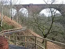 The Ballochmyle Viaduct was designed by John Miller for the Glasgow, Paisley, Kilmarnock and Ayr Railway during the mid 1840s.[2][3] The line was the northern part of the railway from Glasgow to Carlisle via Kilmarnock. The viaduct was required to cross the River Ayr. The resident engineer was William McCandlish and the contractors were Ross & Mitchell.[3][1][4]