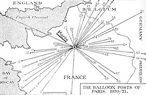 Historically, balloons were used to transport mail from Paris during the Siege of Paris of 1870–1871. About 66 unguided mail balloons were released from Paris to communicate with the outside world; the great majority succeeded in delivering their cargo. As Prussian forces surrounded the city, telegraph lines were cut and messengers were captured, shot or turned back. Two services were proposed: ballon monté (manned balloon) and ballon non-monté (unmanned).[1] In practice only manned flights were used. After the siege, Anglo-French scientist Dr Pierre Wesby travelled to Burton-on-Trent, where in 1873 he started a business to transport mail from England across the Irish Sea to Dublin. It is not known how this venture turned out; the records of Wesby's company were lost in 1916 when a bomb from the Zeppelin L 19 destroyed them.