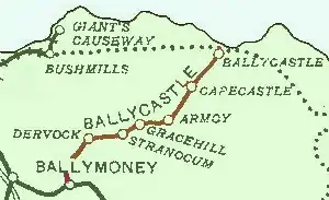 Ballycastle Railway was a 3 ft (914 mm) narrow gauge railway line which ran from Ballycastle to Ballymoney, both in County Antrim, Northern Ireland.[1]