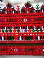 Different regions of Balochi tribes have their own distinct needlework designs.[6] This craft has traditionally been created only by women, and has been passed down through the generations.[4][7][6] The stitching designs and patterning hold meaning; common motifs include arrows, "chicken feet", diamonds, and flowers.[6] Some of the designs may also incorporate other materials such as small pieces of mirror (known as shisha), different colors of thread, and/or pieces of colored fabric.[1] The needlework was traditionally used for decorating women's clothing, however it has also been used for decorating pillows, curtains, tablecloths, and men's clothing.[8]