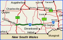 The Balonne Highway, a state highway of Queensland, is the continuation westward of State Route 49 (Moonie Highway) from the town of St George to its termination at Cunnamulla.[1] There are no large settlements between St George and Cunnamulla.[2]