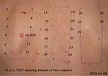 People allergic to balsam of Peru or other chemically related substances may experience a contact dermatitis reaction.[8] If they have oral exposure, they may experience stomatitis (inflammation and soreness of the mouth or tongue), and cheilitis (inflammation, rash, or painful erosion of the lips, oropharyngeal mucosa, or angles of their mouth).[8][12][21] If they ingest it, they may experience pruritus and contact dermatitis in the perianal region, possibly due to unabsorbed substances in the feces.[12][26] It can cause a flare-up of hand eczema.[8] Among the other allergic reactions to balsam of Peru are generalized or resistant plantar dermatitis, rhinitis, and conjunctivitis,[12][27] In a case study in Switzerland, a woman who was allergic to balsam of Peru was allergic to her boyfriend's semen following intercourse after he drank large amounts of Coca-Cola.[28]