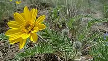 It tends to grow in rockier habitats than its cousin, arrow-leaf balsamroot (Balsamorhiza sagittata).[2] It hybridizes with arrow-leaf balsamroot, which has arrow shaped leaves.[2] The result is a plant with leaves that are arrow shaped, but also deeply divided.[2]