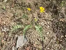 The leaves are compound pinnate, with the leaflet divisions also divided or deeply lobed. Basal leaves are hairy and may be up to 16 inches (41 cm) long.[2] There may be one to several stems, which are leafless and hairy, and topped by one flower each.[2][6]