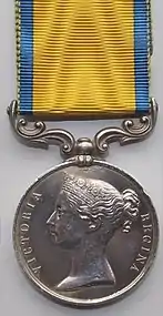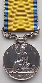 The Baltic Medal was a campaign medal approved on 6 June 1856, for issue to officers and men of the Royal Navy, Royal Marines, and Royal Sappers and Miners who served between March 1854 and August 1855 in the Baltic Sea operations against Russia in the Baltic theatre of the Crimean War, or Åland War. The medal primarily covered naval actions but was also awarded to 106 men of the Royal Sappers and Miners who were landed to place demolition charges against Russian fortifications at Bomarsund and Sveaborg.[2]