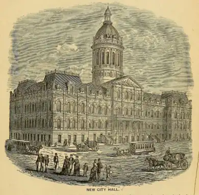 In its early years, Baltimore city government met in a series of buildings that it purchased or leased, including the Maryland Insurance Company building on South Street from 1801 to approximately 1812; the Baltimore Dancing Assembly Rooms at the northeast corner of Holliday and East Streets (later Fayette Street) from 1818 to 1823; the Baltimore Exchange Company from 1823 to 1830; and Peale's Baltimore Museum and Gallery of Fine Arts from 1830 until city government moved into the new City Hall in the spring of 1875.[4] At the laying of the cornerstone for the new building on October 18, 1867, speaker John H.B. Latrobe noted of the museum location that "the First Branch held its sessions in what was formerly the very modest picture gallery of Peale's Museum, and the Second Branch succeeded a collection of stuffed animals in an adjacent room."[5]