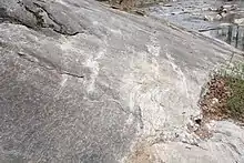 The type locality of the streaked-augen gneiss member includes outcrops along Merryman Branch 125 meters upstream from the Dulaney Valley Road bridge.[2]