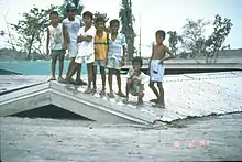 Children on roof of a school in Bamban, that was buried by lahars during the 1991 eruption of Mt. Pinatubo.