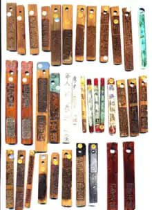 Bamboo tallies (Traditional Chinese: 錢籌; Simplified Chinese: 钱筹; Pinyin: qián chóu), alternatively known as bamboo tokens or bamboo money, were a type of alternative currency that was produced in Eastern China (primarily in the provinces of Shandong, Jiangsu, and Zhejiang often around the cities of Suzhou and Wuxi) from the 1870s until the 1940s and were used to supplement Chinese cash coins and other small denomination Chinese currencies in a manner similar to paper money.[1] Some bamboo tallies were issued in denominations of wén (文) or "strings of cash coins" (串), some bamboo tallies were denominated in qián (錢), tóngyuán (銅元, machine-struck coins of 10 wén), jiǎo (角), and yáng (洋, foreign silver coins),[2] other than in money bamboo tallies could also be denominated in tea bags.[3] During the same time as bamboo tallies were issued other local businesses manufactured paper money denominated in fēn (分) while others used either copper tokens or money made from bones in a similar fashion.[4]