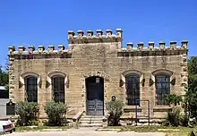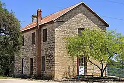 Bandera County was organized in 1856 and used makeshift quarters for jail and courthouse functions until 1877, when the county purchased a two-story stone building constructed in 1868 which is now known as the Old Courthouse. The building served as county courthouse until the present courthouse was built in 1891.[2][3] A former one-story cut stone jail adjacent to the Old Courthouse designed by San Antonio architect Alfred Giles was built in 1881.[4] On October 31, 1979, the two buildings, located on 12th St. between Maple St. and SH 16, were added to the National Register of Historic Places as a single entry.[5] The two buildings are also jointly listed as a State Antiquities Landmark.[6]